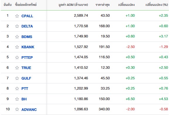 10 อันดับหลักทรัพย์ที่มีมูลค่าการซื้อขายสูงสุด