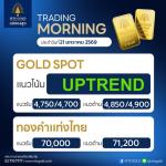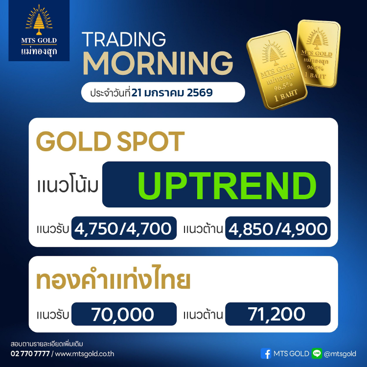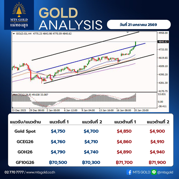 ในเชิงเทคนิค ราคาทองคำเช้านี้สามารถทะลุแนวต้านสำคัญบริเวณ 4,800 เหรียญได้อย่างชัดเจน (Breakout) ส่งสัญญาณแนวโน้มขาขึ้นที่แข็งแกร่ง และเป็นปัจจัยหนุนให้ราคาทองคำในประเทศปรับตัวขึ้นทะลุระดับ 70,000 บาทต่อบาททองคำเป็นครั้งแรก สะท้อนถึงแรงซื้อที่เข้ามาอย่างต่อเนื่องและมีนัยสำคัญ ทั้งนี้ราคาทองคำโลกได้ทำจุดสูงสุดใหม่ (All-Time High) ในปีนี้แล้วเป็นครั้งที่ 5 ตอกย้ำโมเมนตัมเชิงบวกของตลาด อย่างไรก็ตาม จากการปรับตัวขึ้นอย่างรวดเร็วและต่อเนื่อง ภาพรวมในระยะสั้นยังต้องระมัดระวังแรงขายทำกำไร