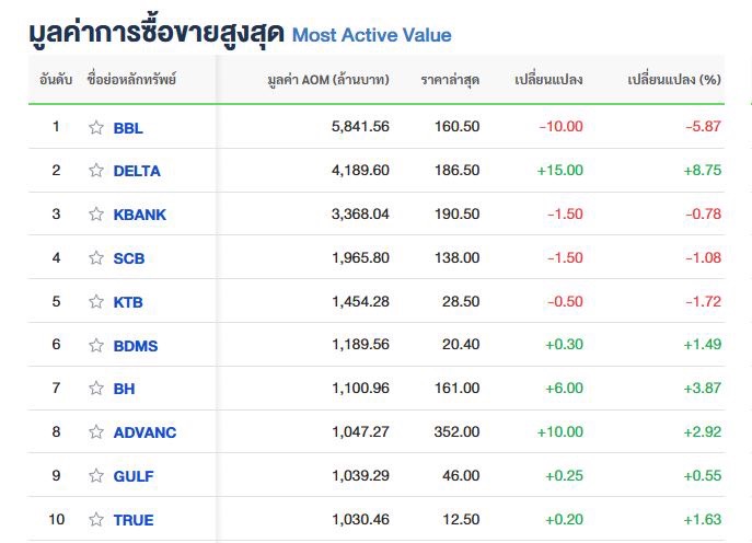 10 อันดับหลักทรัพย์ที่มีมูลค่าการซื้อขายสูงสุด