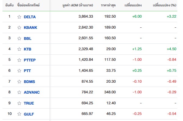 10 อันดับหลักทรัพย์ที่มีมูลค่าการซื้อขายสูงสุด