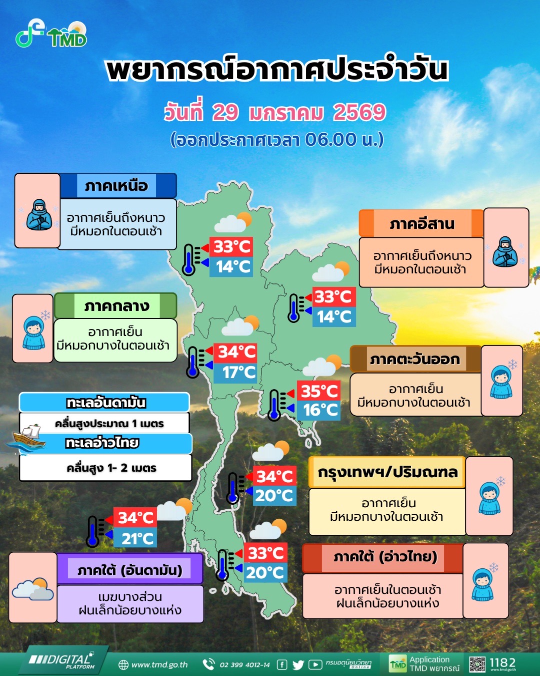 กรมอุตุนิยมวิทยา พยากรณ์อากาศ 24 ชั่วโมงข้างหน้า วันที่ 29 มกราคม 2569 ประเทศไทยมีอากาศเย็นกับมีหมอกบางในตอนเช้า โดยภาคเหนือและภาคตะวันออกเฉียงเหนือยังคงมีอากาศเย็นถึงหนาว เนื่องจากบริเวณความกดอากาศสูงหรือมวลอากาศเย็นกำลังปานกลางปกคลุมที่ประเทศไทยตอนบนมีกำลังอ่อนลง ขอให้ประชาชนดูแลรักษาสุขภาพเนื่องจากสภาพอากาศที่เปลี่ยนแปลง รวมทั้งเพิ่มความระมัดระวังในการสัญจรผ่านบริเวณที่มีหมอกไว้ด้วย