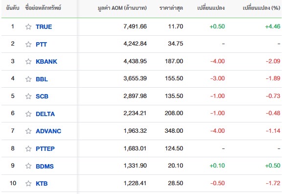 10 อันดับหลักทรัพย์ที่มีมูลค่าการซื้อขายสูงสุด