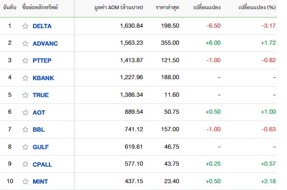 10 อันดับหลักทรัพย์ที่มีมูลค่าการซื้อขายสูงสุด