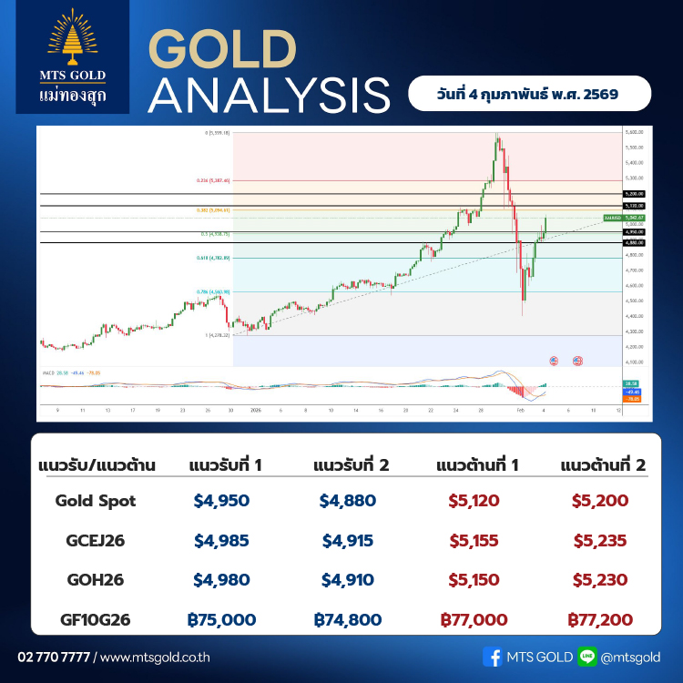 ประเมินแนวรับของราคาทองคำตลาดโลก (Gold Spot) อยู่ที่บริเวณ 4,950–4,880 เหรียญ ขณะที่แนวต้านอยู่ที่ระดับ 5,120–5,200 เหรียญ ส่วนราคาทองคำในประเทศประเมินแนวรับอยู่ที่ระดับ 74,500 บาท และแนวต้านที่ระดับ 76,500 บาท