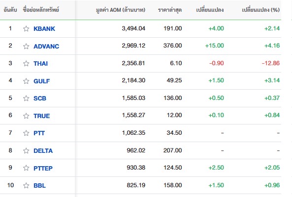 10 อันดับหลักทรัพย์ที่มีมูลค่าการซื้อขายสูงสุด