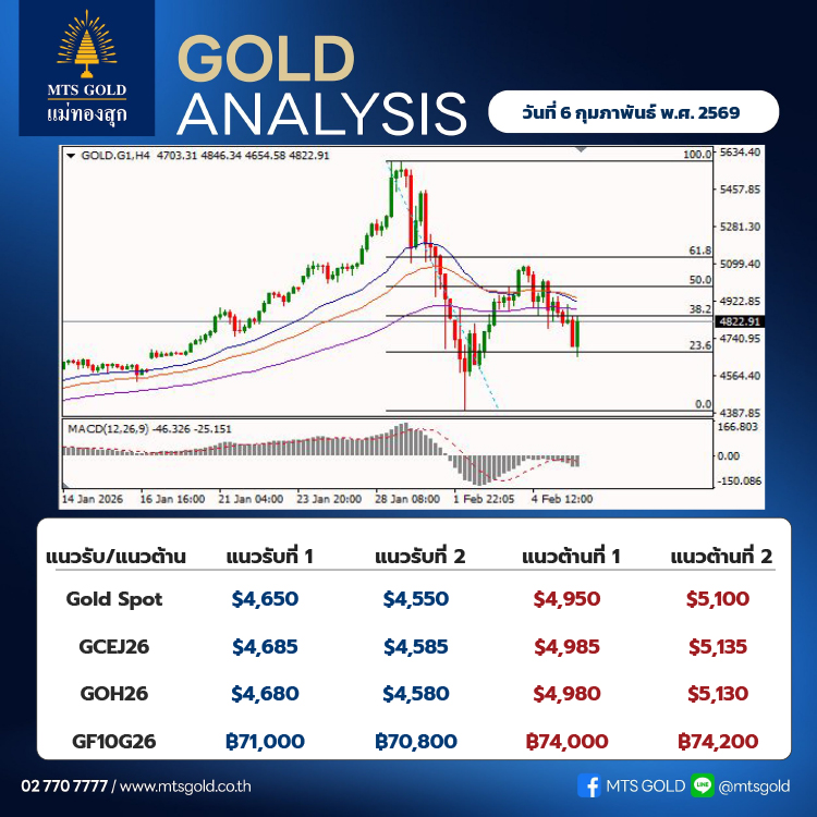 ประเมินกรอบระยะสั้นของราคาทองคำตลาดโลก (Gold Spot) แนวรับอยู่ที่บริเวณ 4,650–4,550 เหรียญ ขณะที่แนวต้านอยู่ที่ระดับ 4,950–5,100 เหรียญ ส่วนราคาทองคำในประเทศประเมินแนวรับอยู่ที่ระดับ 70,500 บาท และแนวต้านที่ระดับ 73,500 บาท