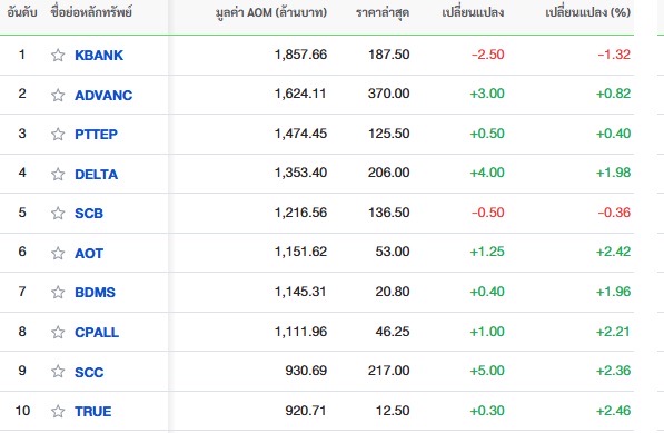 10 อันดับหลักทรัพย์ที่มีมูลค่าการซื้อขายสูงสุด
