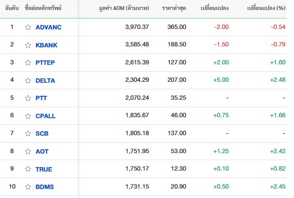 10 อันดับหลักทรัพย์ที่มีมูลค่าการซื้อขายสูงสุด