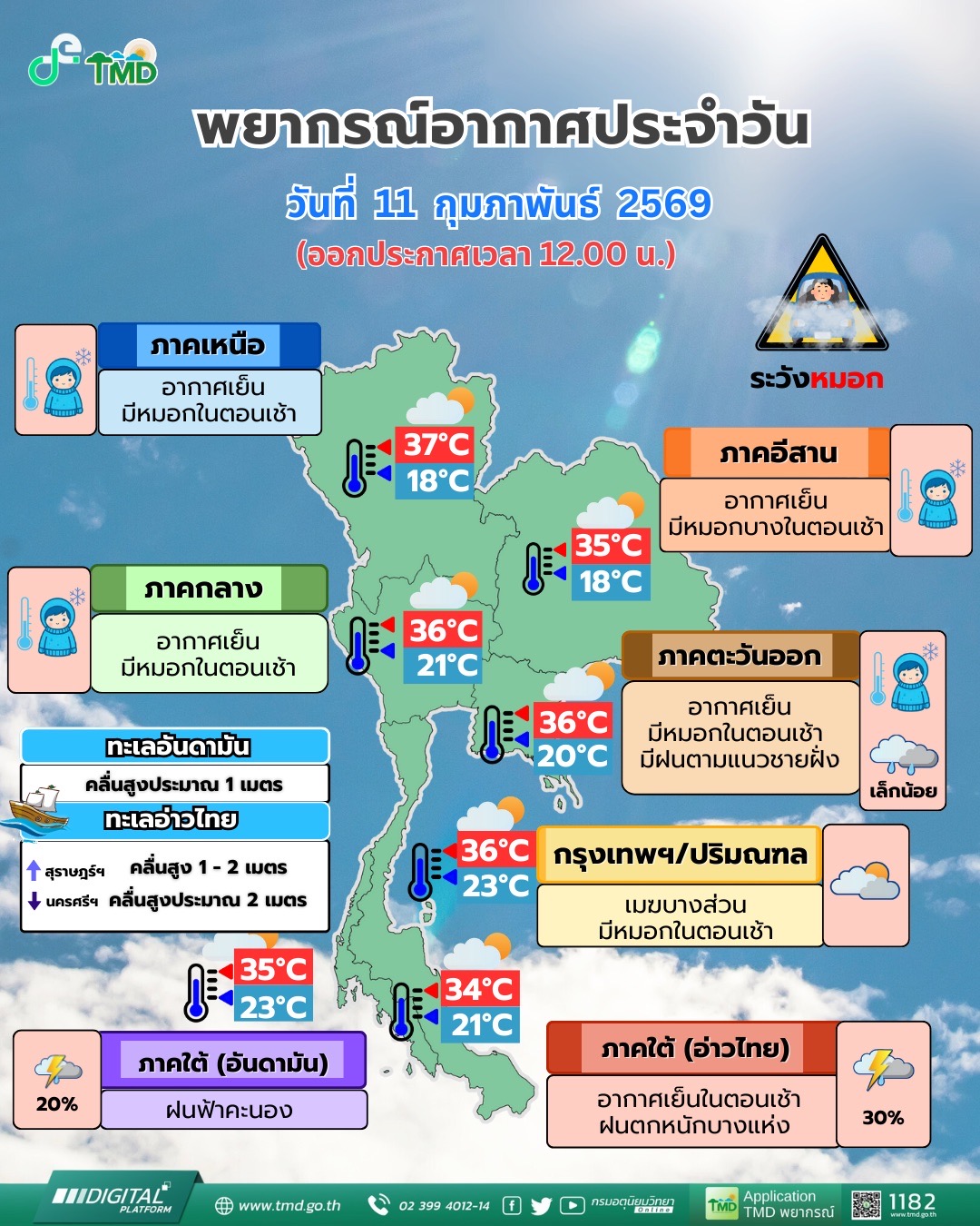 กรมอุตุนิยมวิทยา พยากรณ์อากาศ 24 ชั่วโมงข้างหน้า วันที่ 11 กุมภาพันธ์ 2569 ประเทศไทยตอนบนมีอุณหภูมิสูงขึ้น แต่ยังคงมีอากาศเย็นกับมีหมอกในตอนเช้า เนื่องจากบริเวณความกดอากาศสูงหรือมวลอากาศเย็นกำลังปานกลางปกคลุมประเทศไทยตอนบน ขอให้ประชาชนบริเวณประเทศไทยตอนบนดูแลรักษาสุขภาพเนื่องจากสภาพอากาศที่เปลี่ยนแปลง และขอให้ประชาชนบริเวณภาคเหนือและภาคตะวันออกเฉียงเหนือ ควรระมัดระวังในการสัญจรผ่านบริเวณที่มีหมอกไว้ด้วย