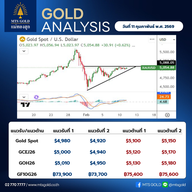 ประเมินกรอบระยะสั้นของราคาทองคำตลาดโลก (Gold Spot) แนวรับอยู่ที่บริเวณ 4,980–4,920 เหรียญ ขณะที่แนวต้านอยู่ที่ระดับ5,100–5,150 เหรียญ ส่วนราคาทองคำในประเทศประเมินแนวรับอยู่ที่ระดับ 73,500 บาท และแนวต้านที่ระดับ 75,000 บาท