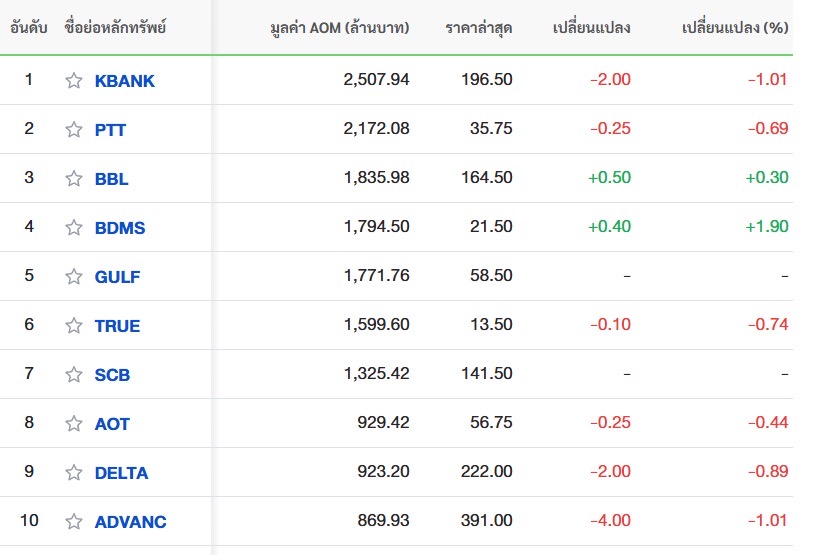 10 อันดับหลักทรัพย์ที่มีมูลค่าการซื้อขายสูงสุด
