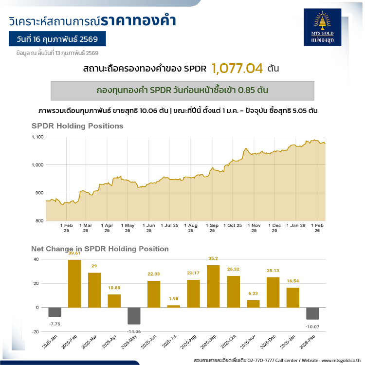 ด้านกองทุนทองคำ SPDR วันก่อนหน้าซื้อเข้า 0.85 ตัน ปัจจุบันถือครองที่ 1,077.04 ตันภาพรวมเดือนกุมภาพันธ์ ขายสุทธิ 10.06 ตัน ขณะที่ปีนี้ ตั้งแต่ 1 ม.ค. - ปัจจุบัน ซื้อสุทธิ 5.05 ตัน