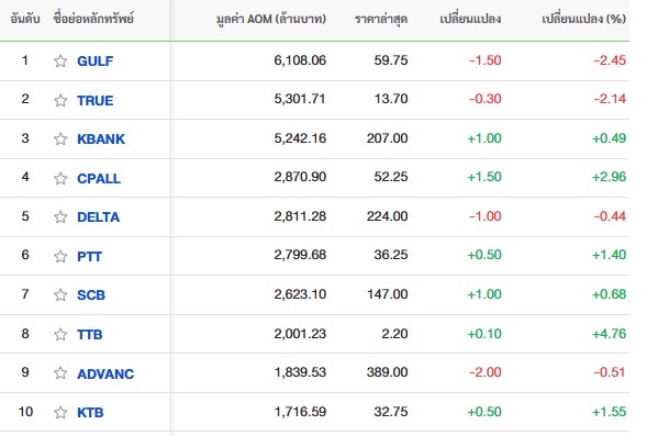 10 อันดับหลักทรัพย์ที่มีมูลค่าการซื้อขายสูงสุด