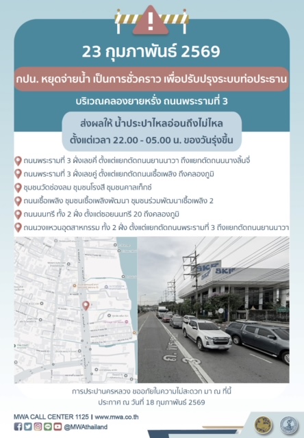 การประปานครหลวง (กปน.) ขอแจ้งให้ทราบว่า จะดำเนินการปรับปรุงระบบท่อประธาน ในพื้นที่บริเวณคลองยายหรั่ง ถนนพระรามที่ 3 เพื่อให้ประชาชนได้รับบริการน้ำประปาอย่างเพียงพอและทั่วถึง จึงมีความจำเป็นต้องหยุดจ่ายน้ำ เป็นการชั่วคราว ในคืนวันจันทร์ที่ 23 กุมภาพันธ์ 2569 ตั้งแต่เวลา 22.00 - 05.00 น. ของวันรุ่งขึ้น โดยระหว่างดำเนินการ ส่งผลให้ น้ำประปาไหลอ่อนถึงไม่ไหล ในพื้นที่ดังต่อไปนี้
