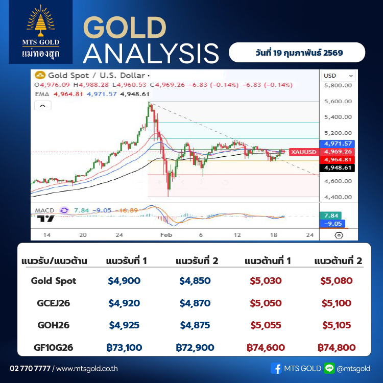 ประเมินกรอบระยะสั้นของราคาทองคำตลาดโลก (Gold Spot) แนวรับอยู่ที่บริเวณ 4,900–4,850 เหรียญ ขณะที่แนวต้านอยู่ที่ระดับ 5,030–5,080 เหรียญ