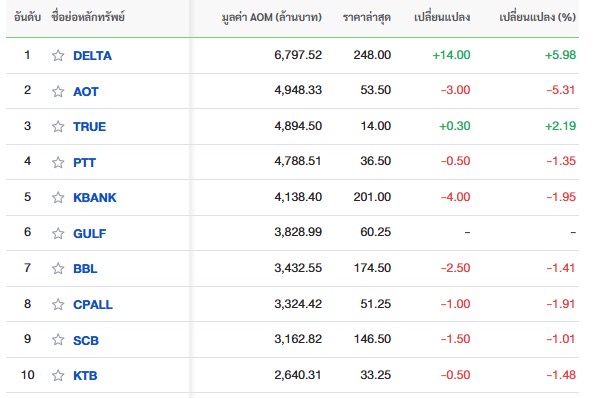 10 อันดับหลักทรัพย์ที่มีมูลค่าการซื้อขายสูงสุด