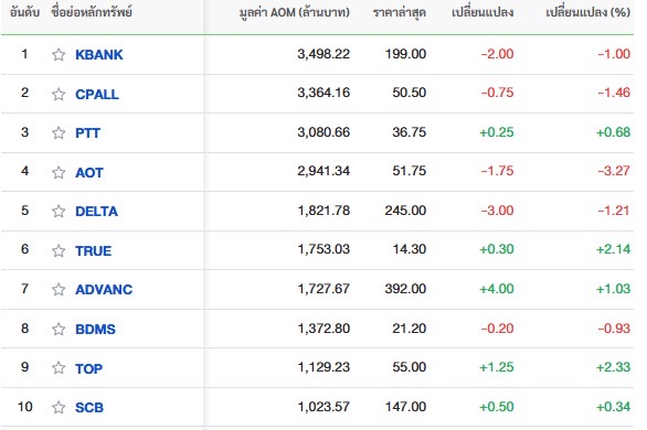 10 อันดับหลักทรัพย์ที่มีมูลค่าการซื้อขายสูงสุด