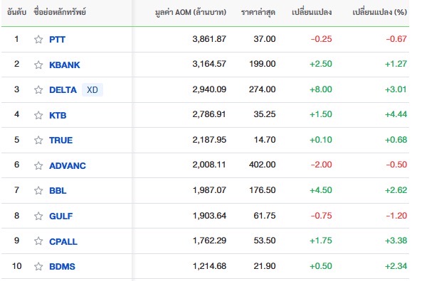 10 อันดับหลักทรัพย์ที่มีมูลค่าการซื้อขาย