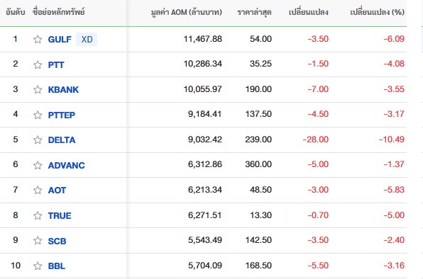 โดยเฉพาะหุ้นขนาดใหญ่ที่มีผลต่อตลาดหุ้นโดยรวมที่ราคาปรับตัวลง อาทิ หุ้น AOT ลดลง 5.83% หุ้น GULF ลดลง 6.09% หุ้น DELTA ลดลง 10.49% รวมถึงหุ้นใหญ่อย่าง PTT, KBANK, BBL,TRUE