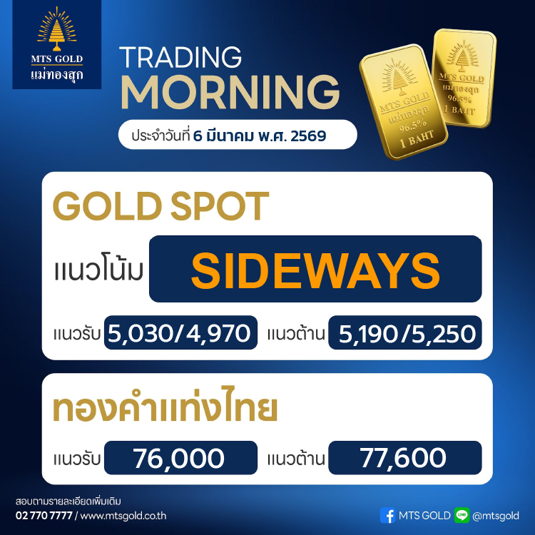 สำหรับ Gold COMEX (GCEJ26) คาดว่าจะมีแนวรับที่ 5,040 เหรียญ และแนวต้านที่ 5,200 เหรียญด้าน Gold Online Futures (GOH26) คาดว่าจะมีแนวรับที่ 5,050 เหรียญ และแนวต้านที่ 5,210 เหรียญ ส่วน Gold Futures 10 บาท (GF10J26) จะมีแนวรับที่ระดับ 76,600 บาท และแนวต้านที่ระดับ 78,200 บาท