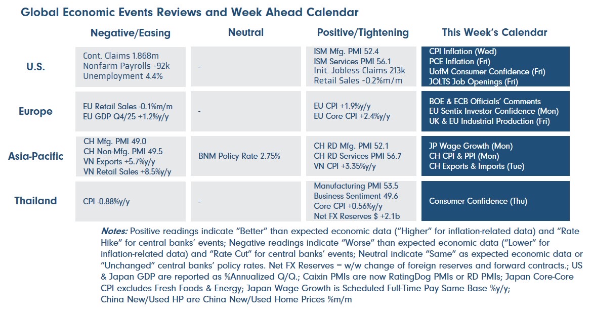 * ฝั่งเอเชีย – ผู้เล่นในตลาดจะรอประเมินแนวโน้มเศรษฐกิจจีน ผ่านรายงานอัตราเงินเฟ้อ CPI และดัชนีราคาผู้ผลิต PPI ในเดือนกุมภาพันธ์ รวมถึงยอดการส่งออกและนำเข้า (Exports & Imports) ในเดือนกุมภาพันธ์ ที่อาจได้รับผลกระทบบ้างจากปัจจัยเทศกาลตรุษจีน ส่วนทางฝั่งญี่ปุ่น ผู้เล่นในตลาดจะรอลุ้น รายงานอัตราการเติบโตของค่าจ้าง (Wage Growth) ในเดือนมกราคม เพื่อประกอบการประเมินแนวโน้มการดำเนินนโยบายการเงินของธนาคารกลางญี่ปุ่น (BOJ) โดยล่าสุด บรรดาผู้เล่นในตลาดประเมิน BOJ มีโอกาสราว 82% ที่จะขึ้นดอกเบี้ยราว 2 ครั้ง ในปีนี้ ทั้งนี้ ผู้เล่นในตลาดไม่ได้ปรับเพิ่มความคาดหวังต่อแนวโน้มการขึ้นดอกเบี้ยของ BOJ มากเท่ากับการปรับมุมมองต่อแนวโน้มดอกเบี้ยนโยบายของบรรดาธนาคารกลางหลักอื่นๆ ท่ามกลางผลกระทบจากสถานการณ์ในตะวันออกกลาง เนื่องจากเศรษฐกิจญี่ปุ่นเสี่ยงได้รับผลกระทบพอสมควร หากราคาพลังงานโลกพุ่งสูงขึ้น (จากงานวิจัยผลกระทบจากสถานการณ์ในตะวันออกกลาง โดย Nippon Research Institute พบว่า อัตราการเติบโตเศรษฐกิจญี่ปุ่นอาจได้รับผลกระทบ ราว -0.1pct ถึง -0.7pct ส่วนอัตราเงินเฟ้อ CPI อาจสูงขึ้น +0.2pct ถึง +1.1pct) เนื่องจากเป็นประเทศนำเข้าพลังงานสุทธิและพึ่งพาพลังงานจากตะวันออกกลางสูง