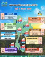 กรมอุตุนิยมวิทยา พยากรณ์อากาศ 24 ชั่วโมงข้างหน้า วันที่ 9 มีนาคม 2569 ประเทศไทยตอนบนมีอากาศร้อนในตอนกลางวัน แต่ยังคงมีฝนฟ้าคะนองกับลมกระโชกแรงเกิดขึ้นได้บางพื้นที่ เนื่องจากความกดอากาศต่ำเนื่องจากความร้อนปกคลุมประเทศไทยตอนบน ประกอบกับมีลมใต้และลมตะวันออกเฉียงใต้พัดนำความชื้นจากทะเลจีนใต้และอ่าวไทยเข้ามาปกคลุมประเทศไทยตอนบน ในขณะที่ประเทศไทยตอนบนมีอากาศร้อน ขอให้ประชาชนในบริเวณดังกล่าวระวังอันตรายจากฝนฟ้าคะนอง และลมกระโชกแรงไว้ด้วย