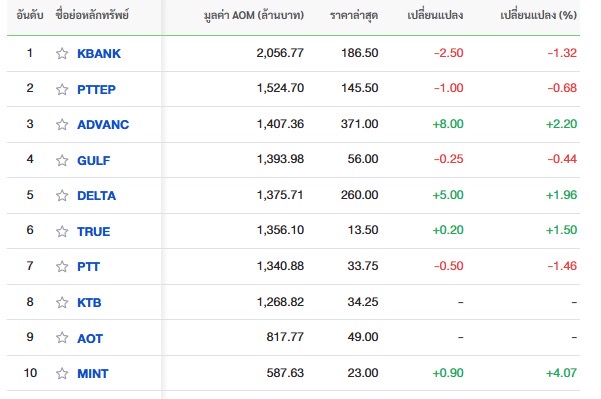 10 อันดับหลักทรัพย์ที่มีมูลค่าการซื้อขายสูงสุด