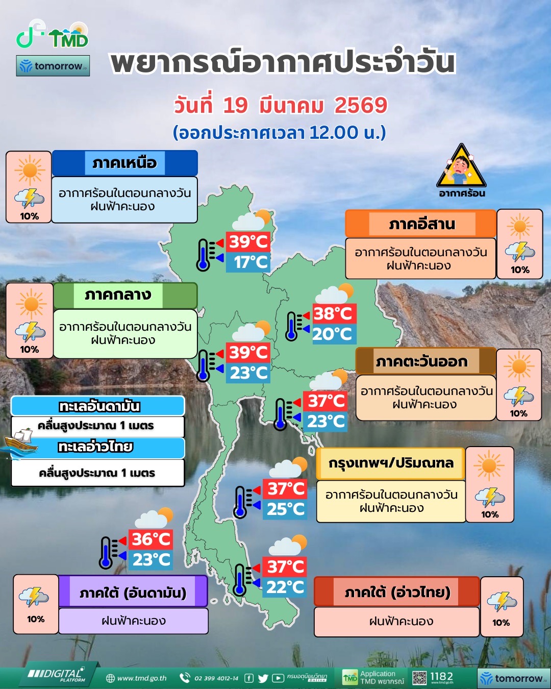 กรมอุตุนิยมวิทยา พยากรณ์อากาศ 24 ชั่วโมงข้างหน้า วันที่ 19 มีนาคม 2569 ประเทศไทยตอนบนมีอากาศร้อนในตอนกลางวัน แต่ยังคงมีฝนฟ้าคะนองบางแห่ง ส่วนมากบริเวณภาคเหนือตอนล่าง ภาคกลาง และภาคตะวันออก เนื่องจากความกดอากาศต่ำเนื่องจากความร้อนปกคลุมประเทศไทยตอนบน ในขณะที่มีลมใต้และลมตะวันออกเฉียงใต้พัดนำความชื้นจากทะเลจีนใต้และอ่าวไทยเข้ามาปกคลุมบริเวณประเทศไทยตอนบน ขอให้ประชาชนบริเวณประเทศไทยตอนบนดูแลรักษาสุขภาพ เนื่องจากสภาพอากาศที่ร้อน และระวังอันตรายจากฝนฟ้าคะนอง