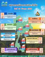 กรมอุตุนิยมวิทยา พยากรณ์อากาศ 24 ชั่วโมงข้างหน้า วันที่ 20 มีนาคม 2569 ประเทศไทยตอนบนมีอากาศร้อนในตอนกลางวัน แต่ยังคงมีฝนฟ้าคะนองบางแห่ง ส่วนมากบริเวณภาคเหนือตอนล่าง ภาคตะวันออกเฉียงเหนือตอนล่าง ภาคกลาง และภาคตะวันออก เนื่องจากความกดอากาศต่ำเนื่องจากความร้อนปกคลุมประเทศไทยตอนบน ในขณะที่มีลมใต้และลมตะวันออกเฉียงใต้พัดนำความชื้นจากทะเลจีนใต้และอ่าวไทยเข้ามาปกคลุมบริเวณประเทศไทยตอนบน ขอให้ประชาชนบริเวณประเทศไทยตอนบนดูแลรักษาสุขภาพ เนื่องจากสภาพอากาศที่ร้อน และระวังอันตรายจากฝนฟ้าคะนอง สำหรับภาคใต้มีฝนฟ้าคะนองบางแห่ง เนื่องจากลมตะวันออกเฉียงใต้พัดปกคลุมอ่าวไทย ภาคใต้ และทะเลอันดามัน ส่วนคลื่นลมบริเวณอ่าวไทยและทะเลอันดามันมีกำลังอ่อนโดยมีคลื่นสูงประมาณ 1 เมตร บริเวณที่มีฝนฟ้าคะนองคลื่นสูงมากกว่า 2 เมตร ขอให้ชาวเรือบริเวณอ่าวไทยและทะเลอันดามันเดินเรือด้วยความระมัดระวัง และหลีกเลี่ยงการเดินเรือในบริเวณที่มีฝนฟ้าคะนองไว้ด้วย ฝุ่นละอองในระยะนี้ ประเทศไทยตอนบนมีการสะสมของฝุ่นละอองหรือหมอกควันอยู่ในเกณฑ์ปานกลาง เนื่องจากมีการระบายอากาศอยู่ในเกณฑ์ปานกลาง พยากรณ์อากาศสำหรับประเทศไทย 06:00 น. วันนี้ ถึง 06:00 น. วันพรุ่งนี้ ภาคเหนือ อากาศร้อนในตอนกลางวัน โดยมีฝนฟ้าคะนอง ร้อยละ 10 ของพื้นที่ ส่วนมากบริเวณจังหวัดตาก พิษณุโลก และเพชรบูรณ์ อุณหภูมิต่ำสุด 18-25 องศาเซลเซียส อุณหภูมิสูงสุด 34-39 องศาเซลเซียส ลมตะวันตกเฉียงใต้ ความเร็ว 5-15 กม./ชม. ภาคตะวันออกเฉียงเหนือ อากาศร้อนในตอนกลางวัน โดยมีฝนฟ้าคะนอง ร้อยละ 20 ของพื้นที่ ส่วนมากบริเวณจังหวัดชัยภูมิ ขอนแก่น มหาสารคาม นครราชสีมา บุรีรัมย์ สุรินทร์ ศรีสะเกษ และอุบลราชธานี อุณหภูมิต่ำสุด 20-24 องศาเซลเซียส อุณหภูมิสูงสุด 36-38 องศาเซลเซียส ลมตะวันออกเฉียงใต้ ความเร็ว 10-15 กม./ชม. ภาคกลาง อากาศร้อนในตอนกลางวัน โดยมีฝนฟ้าคะนอง ร้อยละ 10 ของพื้นที่ ส่วนมากบริเวณจังหวัดลพบุรี สระบุรี กาญจนบุรี ราชบุรี นครปฐม สมุทรสาคร และสมุทรสงคราม อุณหภูมิต่ำสุด 24-26 องศาเซลเซียส อุณหภูมิสูงสุด 36-38 องศาเซลเซียส ลมใต้ ความเร็ว 10-15 กม./ชม. ภาคตะวันออก อากาศร้อนในตอนกลางวัน โดยมีฝนฟ้าคะนอง ร้อยละ 10 ของพื้นที่ ส่วนมากบริเวณจังหวัดนครนายก ปราจีนบุรี ฉะเชิงเทรา ชลบุรี ระยอง จันทบุรี และตราด อุณหภูมิต่ำสุด 24-27 องศาเซลเซียส อุณหภูมิสูงสุด 33-37 องศาเซลเซียส ลมตะวันออกเฉียงใต้ ความเร็ว 15-30 กม./ชม. ทะเลมีคลื่นสูงประมาณ 1 เมตร บริเวณที่มีฝนฟ้าคะนองคลื่นสูงมากกว่า 2 เมตร ภาคใต้(ฝั่งตะวันออก) มีฝนฟ้าคะนอง ร้อยละ 10 