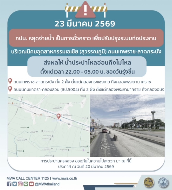 การประปานครหลวง (กปน.) ขอแจ้งให้ทราบว่า จะดำเนินการตามแผนปรับปรุงระบบท่อประธาน ในพื้นที่บริเวณนิคมอุตสาหกรรมเอเซีย (สุวรรณภูมิ) ถนนเทพราช-ลาดกระบัง เพื่อให้ประชาชนได้รับบริการน้ำประปาอย่างเพียงพอและทั่วถึง จึงมีความจำเป็นต้องหยุดจ่ายน้ำ เป็นการชั่วคราว ในคืนวันจันทร์ที่ 23 มีนาคม 2569 ตั้งแต่เวลา 22.00 - 05.00 น. ของวันรุ่งขึ้น โดยระหว่างดำเนินการ ส่งผลให้ น้ำประปาไหลอ่อนถึงไม่ไหล ในพื้นที่ดังต่อไปนี้