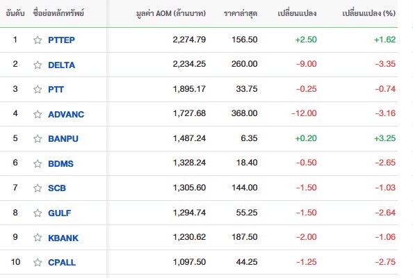 10 อันดับหลักทรัพย์ที่มีมูลค่าการซื้อขายสูงสุด
