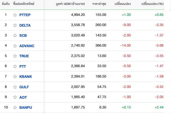 10 อันดับหลักทรัพย์ที่มีมูลค่าการซื้อขายสูงสุด
