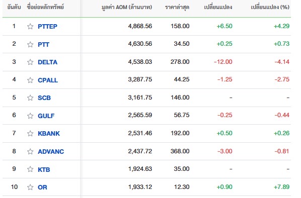 10 อันดับหลักทรัพย์ที่มีมูลค่าการซื้อขายสูงสุด