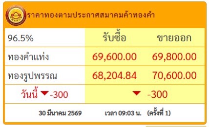 สมาคมค้าทองคำประกาศราคาทองวันนี้ (30 มี.ค.2569) ครั้งที่ 1 ปรับลดลง 300 บาท เทียบกับราคาปิดเมื่อวานนี้