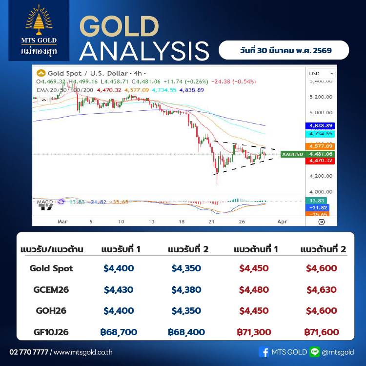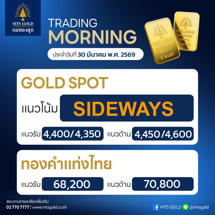 ทั้งนี้ ทิศทางราคายังคงขึ้นอยู่กับปัจจัยหลัก คือ ท่าทีของสหรัฐฯ ต่อสถานการณ์สงคราม ซึ่งจะเป็นตัวกำหนด ทิศทางของตลาดทองคำในระยะสั้น ประเมินกรอบระยะสั้นของ ราคาทองคำตลาดโลก (Gold Spot) แนวรับอยู่ที่บริเวณ 4,400–4,350 เหรียญ ขณะที่แนวต้านอยู่ที่ระดับ 4,450–4,600 เหรียญ ส่วน ทองคำในประเทศ (Thai Gold) ประเมินแนวรับที่ระดับ 68,200 บาท และแนวต้านที่ระดับ 70,800 บาท