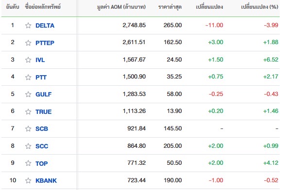 10 อันดับหลักทรัพย์ที่มีมูลค่าการซื้อขายสูงสุด