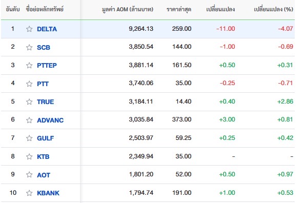 10 อันดับหลักทรัพย์ที่มีมูลค่าการซื้อขายสูงสุด