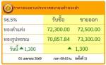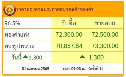สมาคมค้าทองคำประกาศราคาทองวันนี้ (1 เม.ย.2569) ครั้งที่ 1 ปรับขี้น 1,300 บาท เทียบกับราคาปิดเมื่อวานนี้ ทองแท่ง • รับซื้อ บาทละ 72,300 บาท • ขายออก บาทละ 72,500 บาท ทองรูปพรรณ • รับซื้อ บาทละ 70,857.84 บาท • ขายออก บาทละ 73,300 บาท