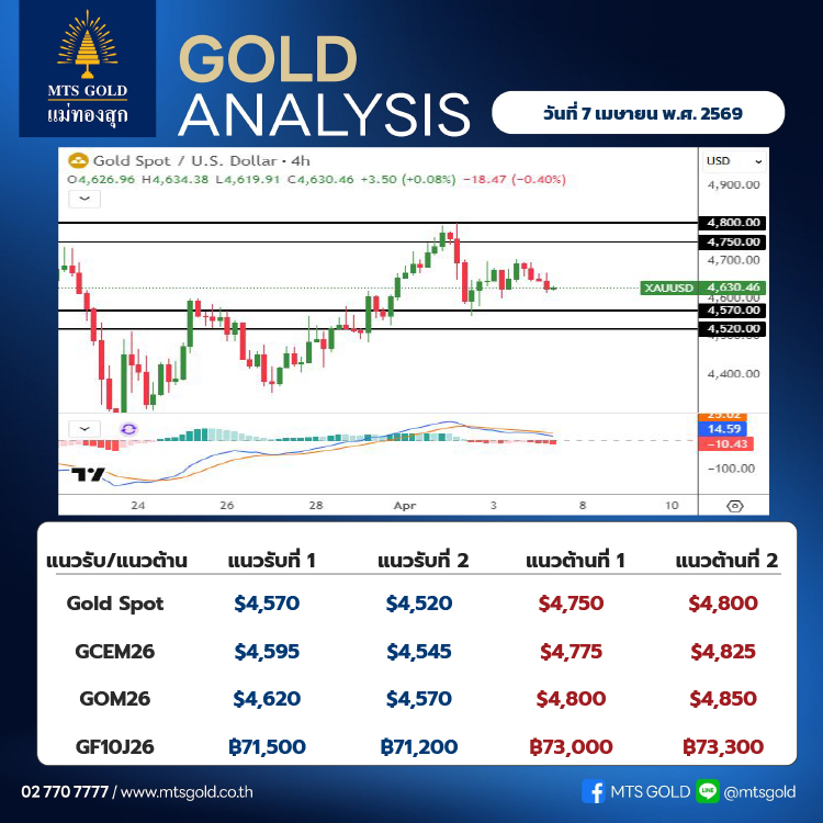 สำหรับ Gold COMEX (GCEM26) คาดว่าจะมีแนวรับที่ 4,595 เหรียญ และแนวต้านที่ 4,775 เหรียญด้าน Gold Online Futures (GOM26) คาดว่าจะมีแนวรับที่ 4,620 เหรียญ และแนวต้านที่ 4,800 เหรียญ ส่วน Gold Futures 10 บาท (GF10J26) จะมีแนวรับที่ระดับ 71,500 บาท และแนวต้านที่ระดับ 73,000 บาท