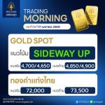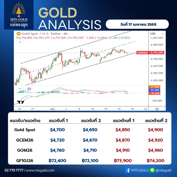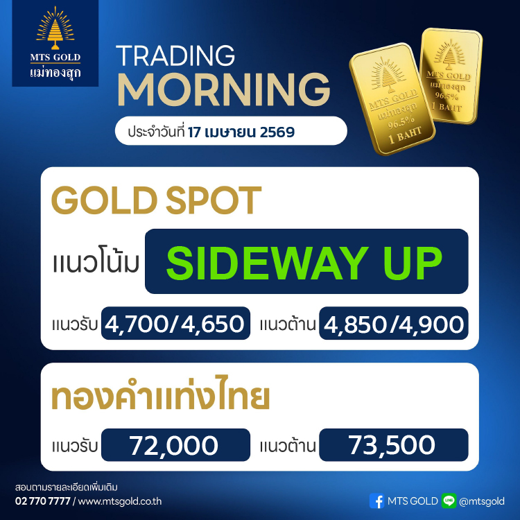 สำหรับ Gold Online Futures คาดว่าจะมีแนวรับที่ 4,760 เหรียญ และแนวต้านที่ 4,910 เหรียญ ส่วน Gold COMEX คาดว่าจะมีแนวรับที่ 4,720 เหรียญ และแนวต้านที่ 4,870 เหรียญ ขณะที่ Gold Futures Series จะมีแนวรับที่ระดับ 72,400 บาท และแนวต้านที่ระดับ 73,900 บาท