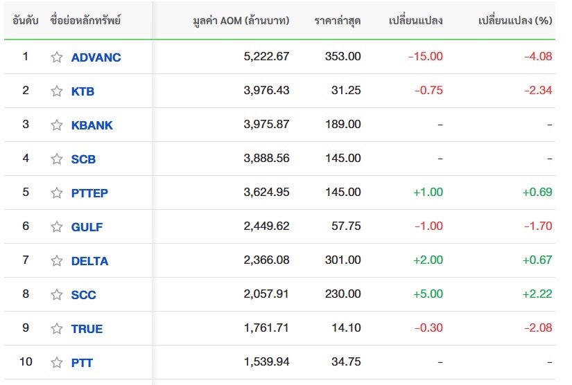 10 อันดับหลักทรัพย์ที่มีมูลค่าการซื้อขายสูงสุด
