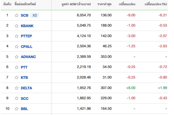 10 อันดับหลักทรัพย์ที่มีมูลค่าการซื้อขายสูงสุด