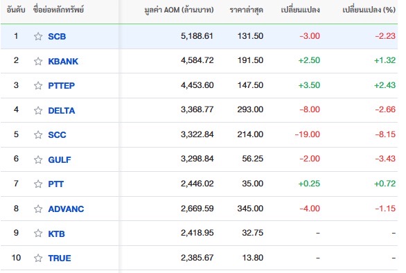 10 อันดับหลักทรัพย์ที่มีมูลค่าการซื้อขายสูงสุด