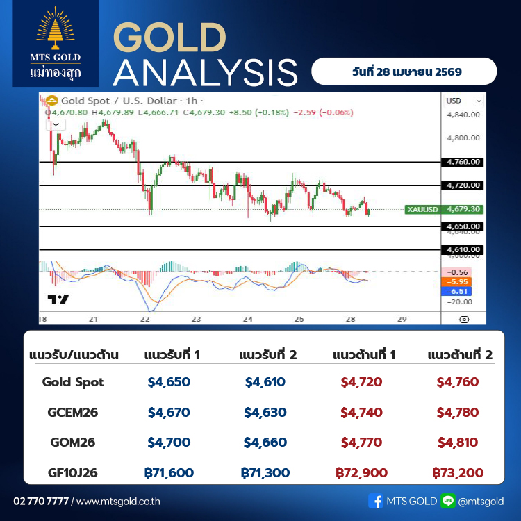 สำหรับ Gold COMEX (GCEM26) แนวรับอยู่ที่ 4,670 เหรียญ และแนวต้านอยู่ที่ 4,740 เหรียญ ด้าน Gold Online Futures (GOM26) แนวรับอยู่ที่ 4,700 เหรียญ และแนวต้านอยู่ที่ 4,770 เหรียญ ส่วน Gold Futures 10 บาท (GF10J26) แนวรับอยู่ที่ระดับ 71,600 บาท และแนวต้านอยู่ที่ระดับ 72,900 บาท