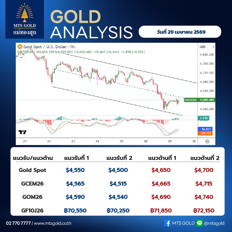 สำหรับ Gold COMEX (GCEM26) แนวรับอยู่ที่ 4,565 เหรียญ และแนวต้านอยู่ที่ 4,665 เหรียญ ด้าน Gold Online Futures (GOM26) แนวรับอยู่ที่ 4,590 เหรียญ และแนวต้านอยู่ที่ 4,690 เหรียญ ส่วน Gold Futures 10 บาท (GF10J26) แนวรับอยู่ที่ระดับ 70,550 บาท และแนวต้านอยู่ที่ระดับ 71,850 บาท