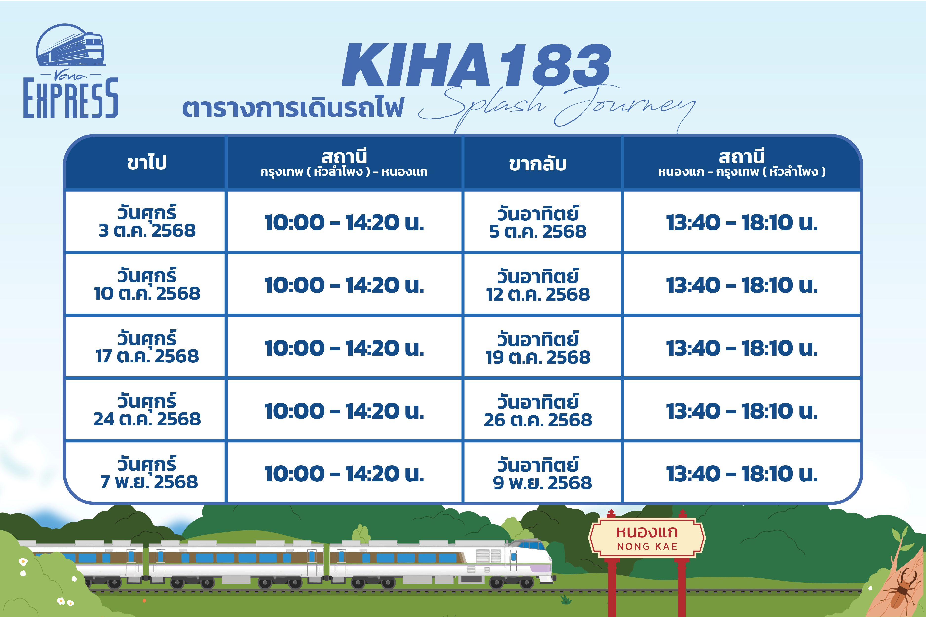 การเดินทางเริ่มต้นขึ้นบนขบวนรถไฟ KIHA 183 ที่เต็มไปด้วยกิจกรรมสร้างรอยยิ้ม ผู้โดยสารทุกท่านจะได้รับ ชุดอาหารเบนโตะสไตล์ญี่ปุ่นที่จัดเตรียมขึ้นอย่างพิถีพิถัน พร้อมเพลิดเพลินกับ การแสดงดนตรีสด และโชว์มายากลกับลูกโป่งดัด (โบโซ่) ที่จะทำให้เด็ก ๆ และผู้โดยสารได้ตื่นตาตื่นใจตลอดเส้นทาง ซึ่งจะกลายเป็นประสบการณ์การเดินทางที่น่าจดจำของครอบครัว และแก๊งเพื่อน เมื่อถึงหัวหิน (สถานีหนองแก) ผู้โดยสารทุกท่านจะมีบริการรถรับส่งตรงถึงโรงแรมและสวนน้ำได้อย่างสะดวกสบายและปลอดภัย (ฟรี)