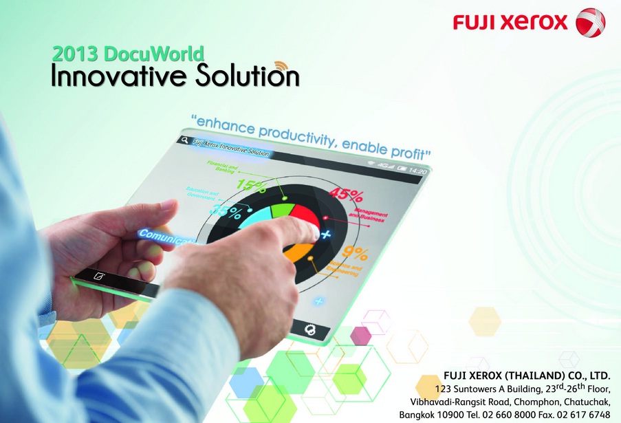 นายชิงชัย ศิริคะเณรัตน์ ผู้จัดการกลุ่มผลิตภัณฑ์มัลติฟังก์ชั่นสำหรับสำนักงาน บริษัท ฟูจิ ซีร็อกซ์ ประเทศไทย จำกัด เปิดเผยว่า ฟูจิ ซีร็อกซ์ ได้จัดงาน DocuWorld  2013 ภายใต้แนวคิด “Fuji Xerox Innovative Solution” ระหว่าง วันที่ 14-15 กุมภาพันธ์ 2556  ณ โรงแรม เอส 31 สุขุมวิท โดยภายในงานได้มีการระดมนวัตกรรมโซลูชั่นและผลิตภัณฑ์ใหม่ล่าสุดของฟูจิ ซีร็อกซ์ มาให้ผู้ร่วมชมงานได้สัมผัสและทดลองใช้จริง รวมถึงงานสัมมนาที่ชี้ให้เห็นถึงแนวโน้มการจัดการงานเอกสารในปี 2556 ซึ่งสามารถตอบโจทย์ทุกความต้องการในงานเอกสารได้อย่างครบวงจร