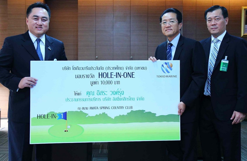นายหลักชัย สุทธิชูจิต (ที่ 2 จากซ้าย) ประธานเจ้าหน้าที่บริหาร บริษัท โตเกียวมารีนประกันภัย (ประเทศไทย) จำกัด (มหาชน) ร่วมแสดงความยินดีและมอบรางวัล “โฮล-อิน-วัน” แก่ นายอิสระ วงศ์รุ่ง (ที่ 1 จากซ้าย) ประธานกรรมการบริหาร บริษัท ลีสซิ่งกสิกรไทย จำกัด ผู้ถือกรมธรรม์ประกันภัยผู้เล่นกอล์ฟ ที่สามารถทำ “โฮล-อิน-วัน” ได้ในการแข่งขันที่ AMATA SPRING COUNTRY CLUB ตามเงื่อนไขที่ระบุไว้ในกรมธรรม์ ณ อาคารธนาคารกสิกรไทย ถนนพหลโยธิน เมื่อเร็วๆนี้