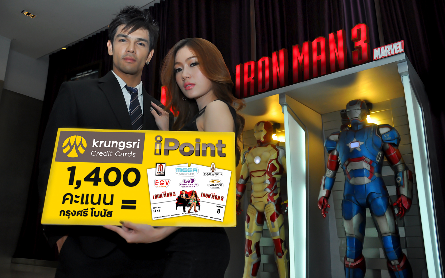 บัตรเครดิตกรุงศรี บัตรเครดิตกรุงศรีเลดี้ไทเทเนียม และบัตรเครดิตโฮมโปรวีซ่า ในเครือ “กรุงศรี คอนซูมเมอร์” ให้ลูกค้าร่วมกิจกรรม iPoint ใช้คะแนนสะสมกรุงศรีโบนัส 1,400 คะแนนแลกบัตรชมภาพยนตร์ซูเปอร์ฮีโร่เรื่อง “ไอรอนแมน 3 (Iron Man 3)” 1 ที่นั่ง ในระหว่างวันที่ 1 – 31 พฤษภาคม 2556 ณ โรงภาพยนตร์เมเจอร์ซีนีเพล็กซ์ อีจีวี พารากอน ซีนี เพล็กซ์ เอสพลานาดซีนีเพล็กซ์ พาราไดซ์ซีนีเพล็กซ์ และเมกาซีนีเพล็กซ์