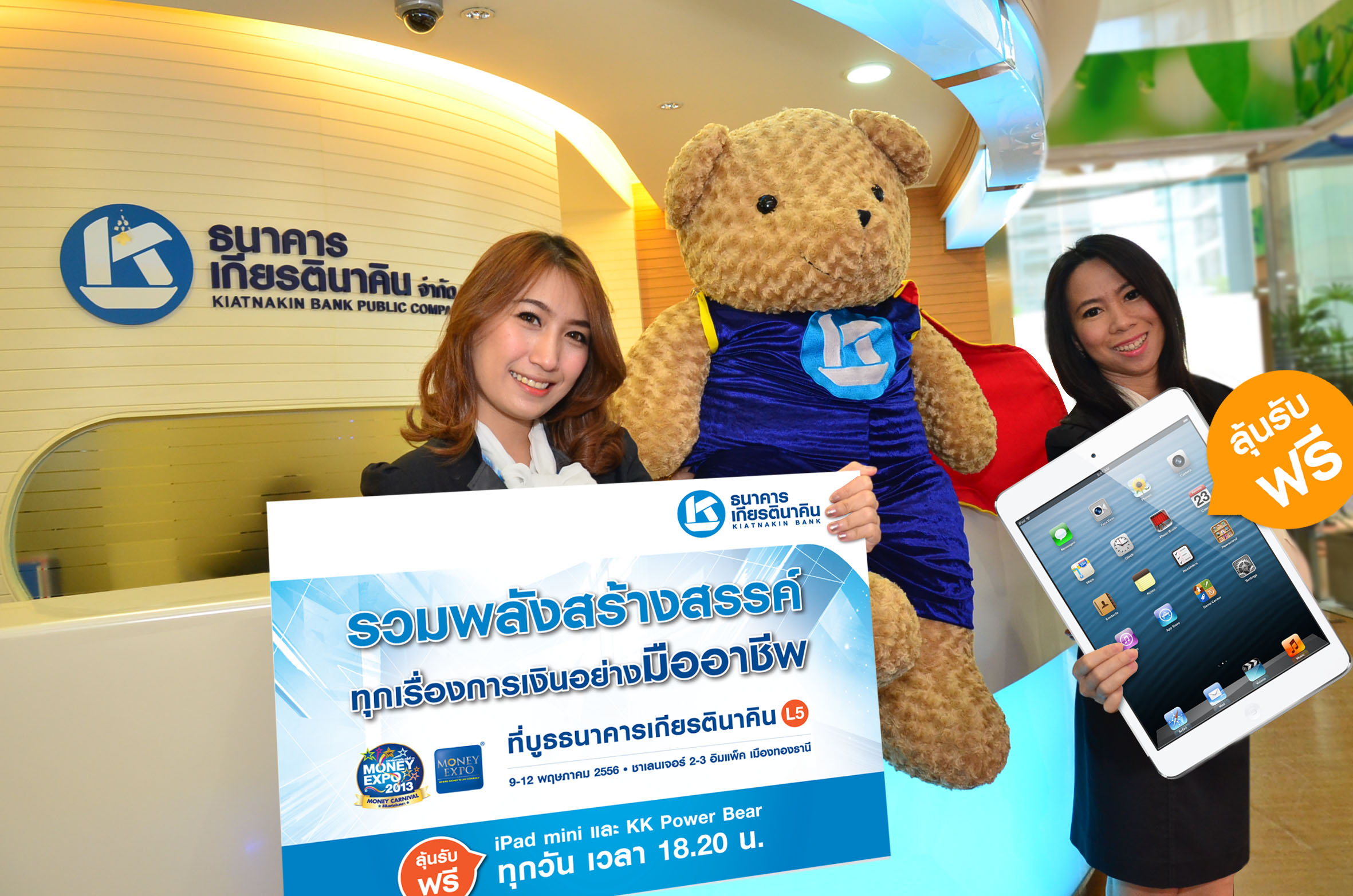 พร้อมตอบแทนลูกค้าที่มาร่วมงานด้วยโปรโมชั่นเงินฝากประจำดอกเบี้ยสูง รวมถึงรับของกำนัลบัตรเติมน้ำมันมูลค่าสูงสุด 3,000 บาท สำหรับผู้ได้รับอนุมัติสินเชื่อรถเพื่อเงินสด KK Car Cash และพิเศษสุดๆ พบกับกิจกรรมลุ้นรับ iPad mini วันละเครื่อง สำหรับลูกค้าที่ทำธุรกรรมการเงิน ที่บูธธนาคารเกียรตินาคิน พร้อมร่วมสนุกลุ้นรับ KK Power Bear สำหรับผู้เยี่ยมชมบูธและร่วมกิจกรรมกับทางธนาคาร จับรางวัลเวลา 18.20 น.ระหว่างวันที่ 9-12 พฤษภาคม 2556 ณ บูธ L5 ชาแลนเจอร์ 2-3 อิมแพ็ค เมืองทองธานี สอบถามข้อมูลโปรโมชั่นเพิ่มเติมได้ที่ โทร. 02 680 3333